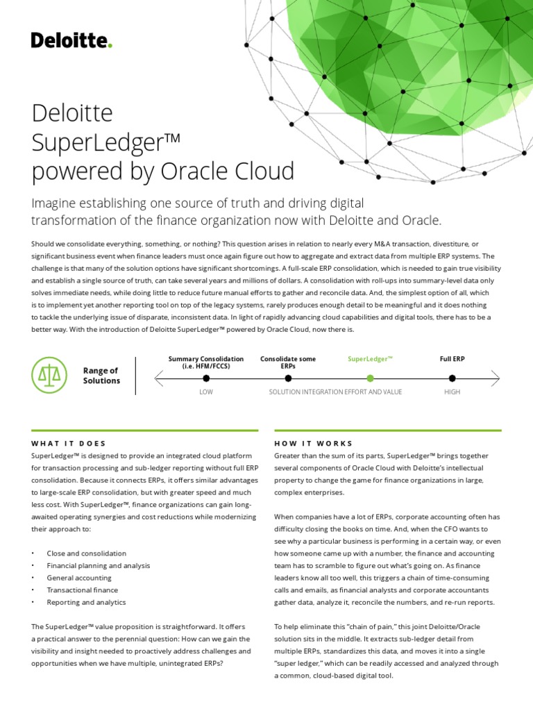 benefit from Deloitte SuperLedger™ powered by Oracle Cloud. establishing one source of truth, and making life easier for key