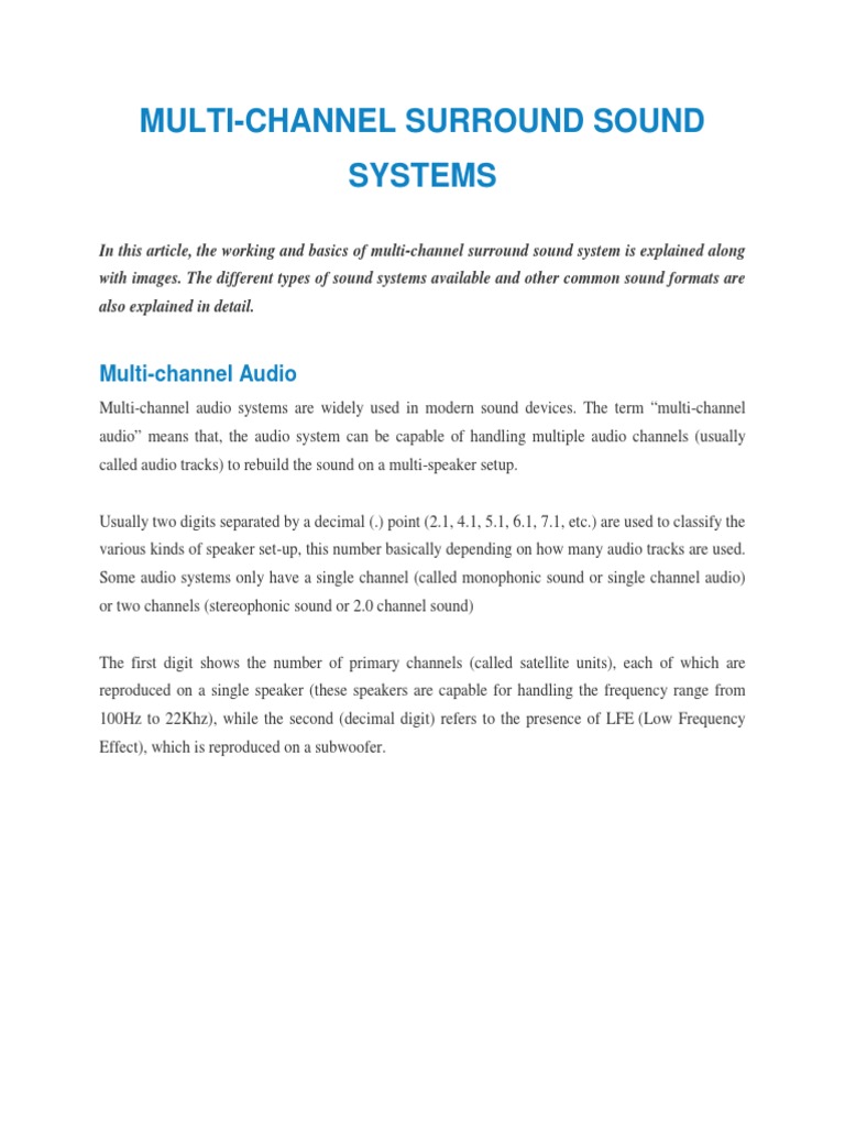 In this article, the working and basics of multi-channel surround sound system is explained along