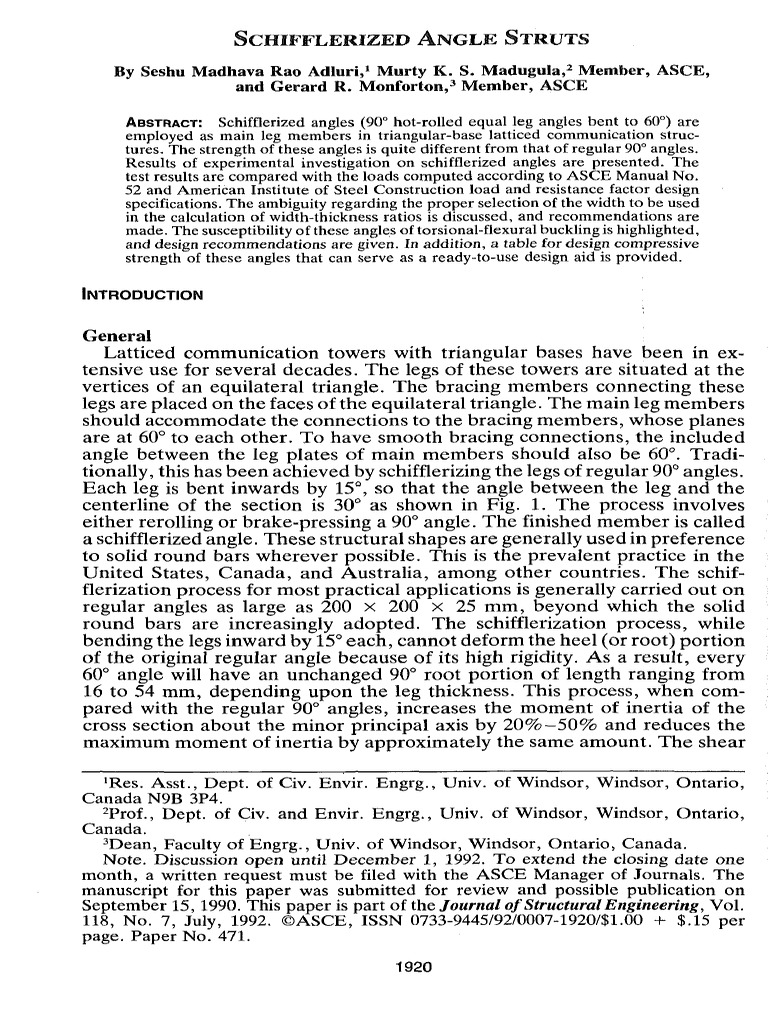 ABSTRACT: Schifflerized angles (90° hot-rolled equal leg angles bent to 60°) are