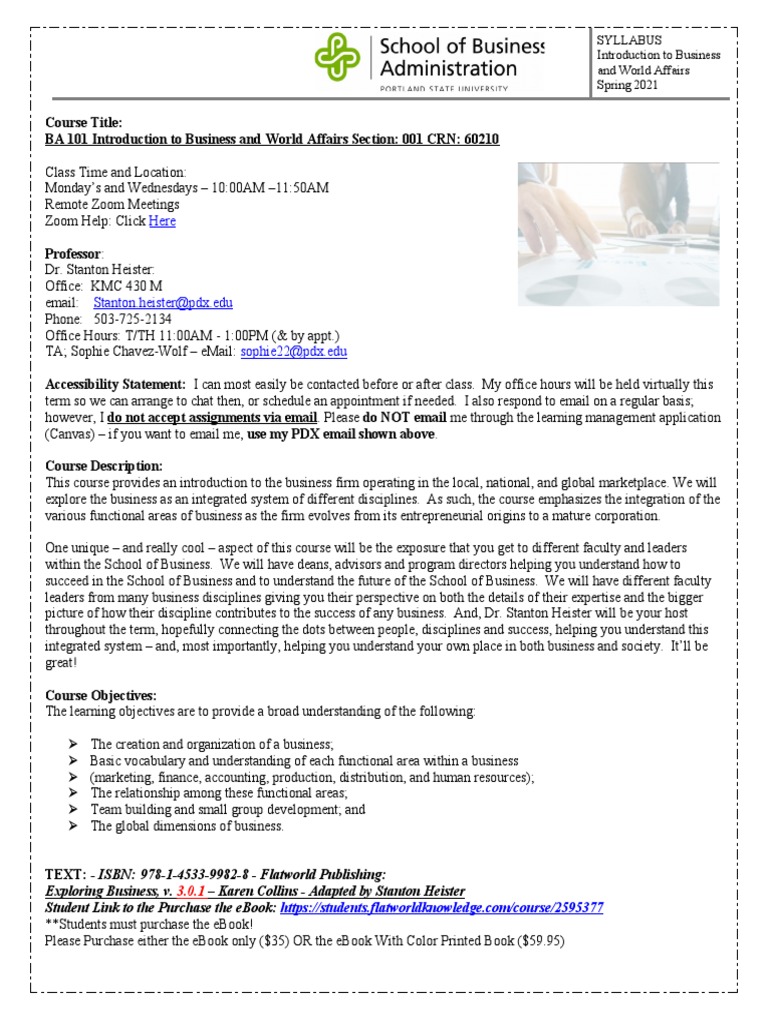 BA 101 Introduction to Business and World Affairs Section: 001 CRN: 60210