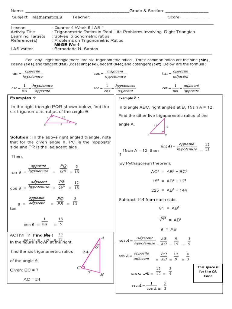 Activity Title : Trigonometric Ratios in Real Life Problems Involving Right Triangles