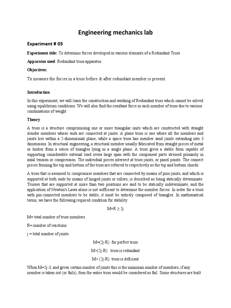In this experiment, we will learn the construction and working of Redundant truss which cannot be solved