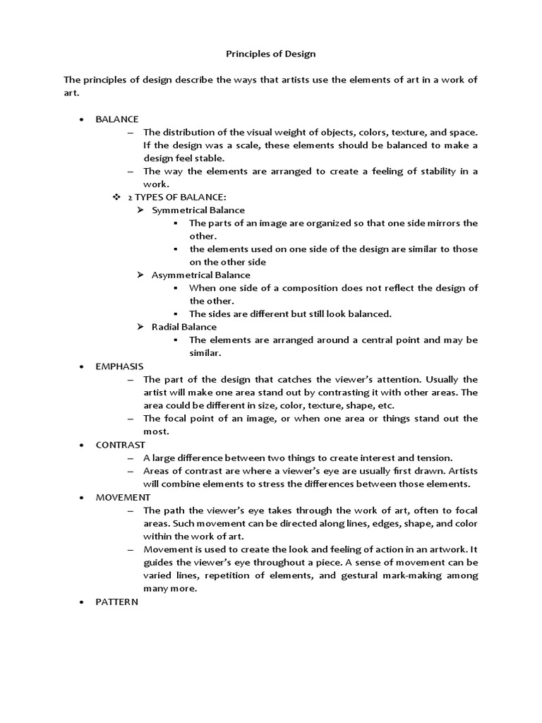 The principles of design describe the ways that artists use the elements of art in a work of