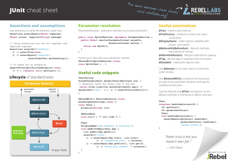 Use assertions to verify the behavior under test: ParameterResolver - extension interface to provide parameters @Test - marks a test method