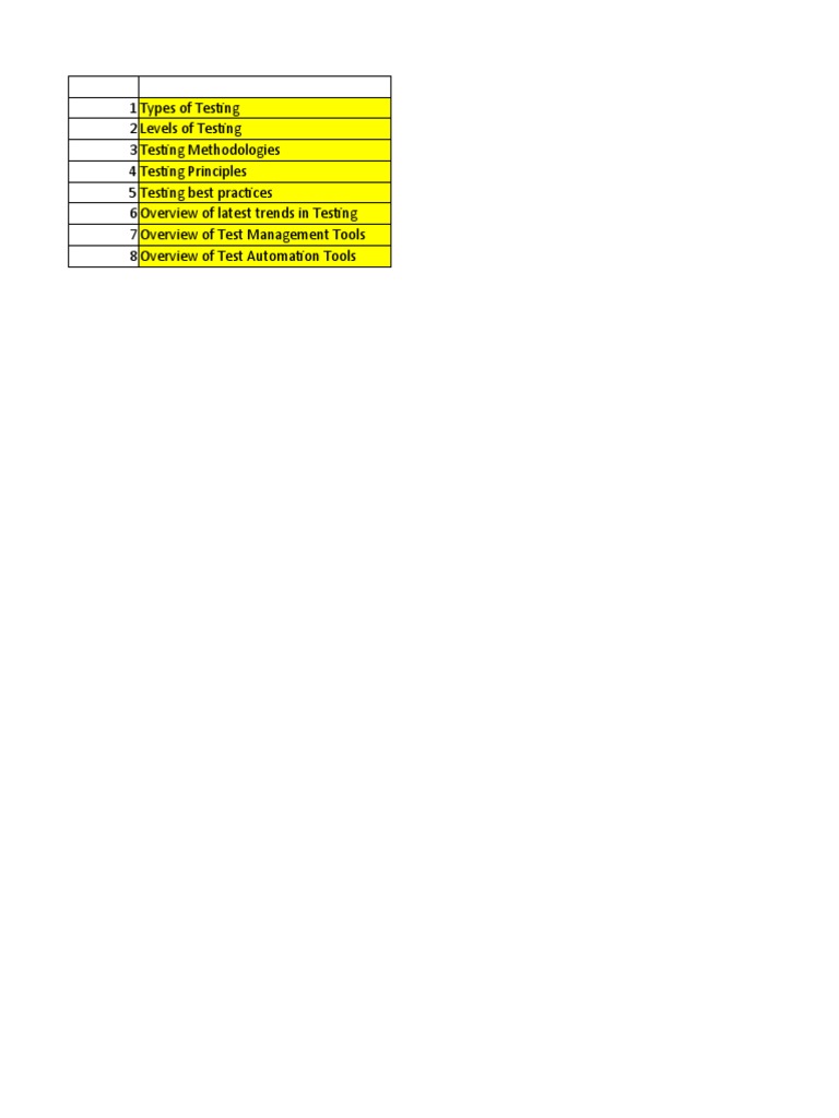 2 Levels of Testing 3 Testing Methodologies 4 Testing Principles 5 Testing best practices 6 Overview of latest trends in Testing 7 Overview of Test Management Tools 8 Overview of Test Automation Tools