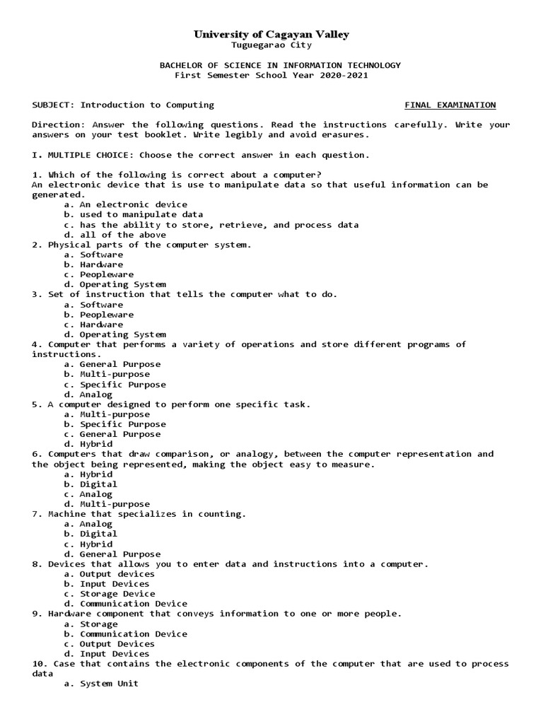 SUBJECT: Introduction to Computing FINAL EXAMINATION