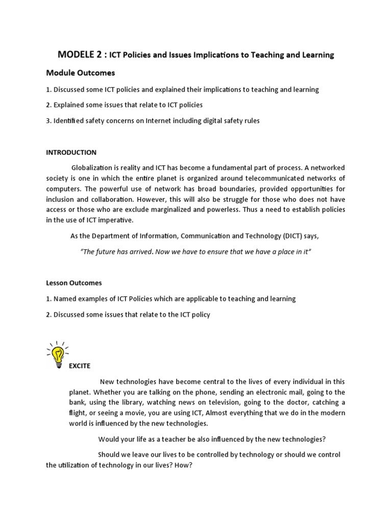 MODELE 2 : ICT Policies and Issues Implications to Teaching and Learning