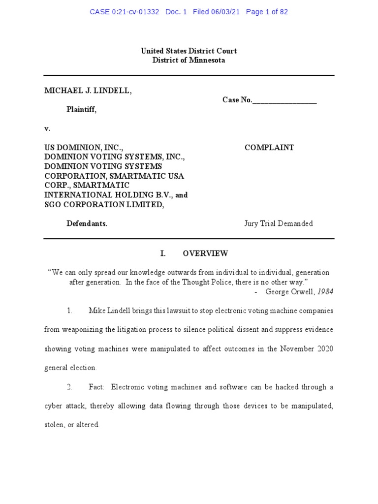 1. Mike Lindell brings this lawsuit to stop electronic voting machine companies