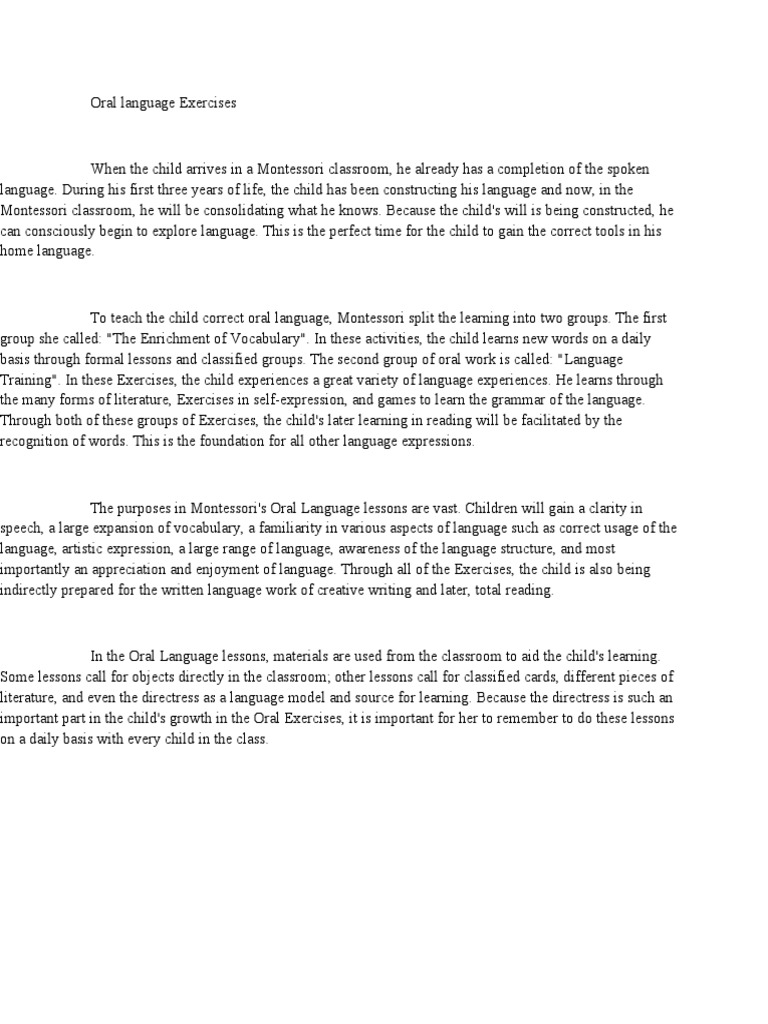 When the child arrives in a Montessori classroom, he already has a completion of the spoken