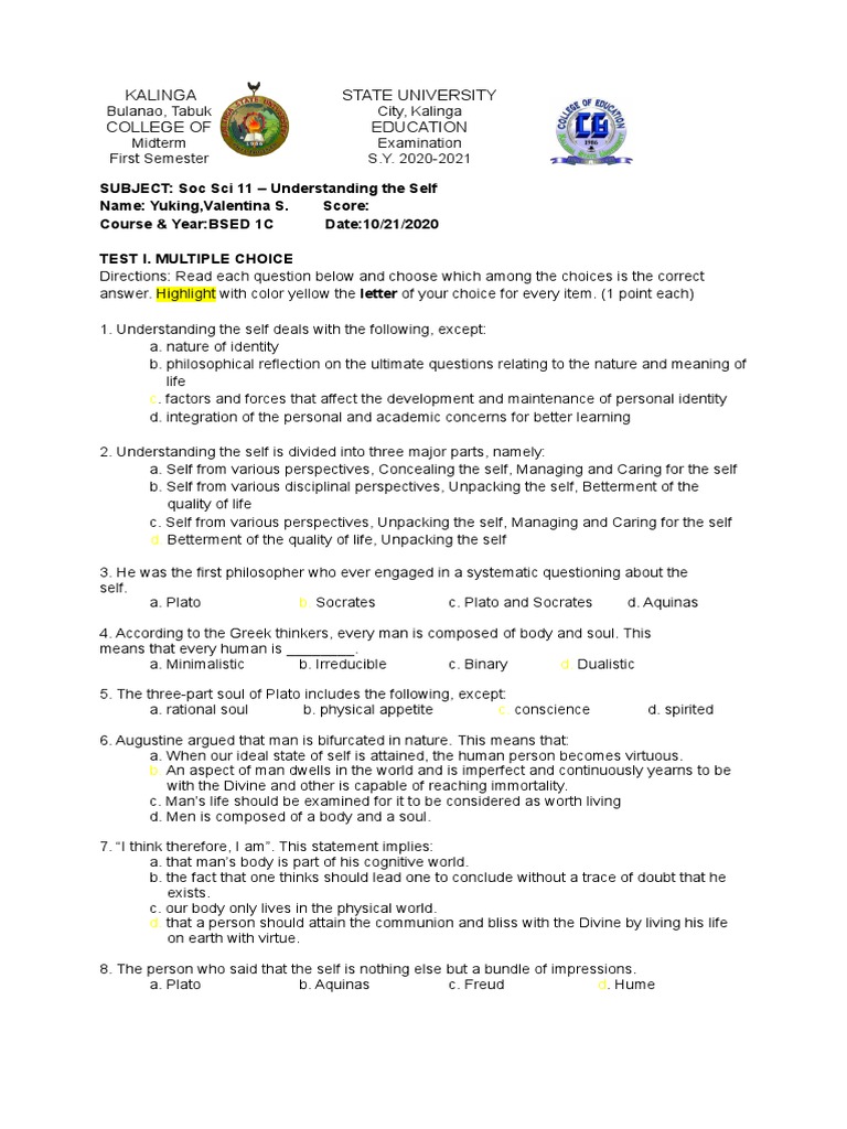 answer. Highlight with color yellow the letter of your choice for every item. (1 point each)