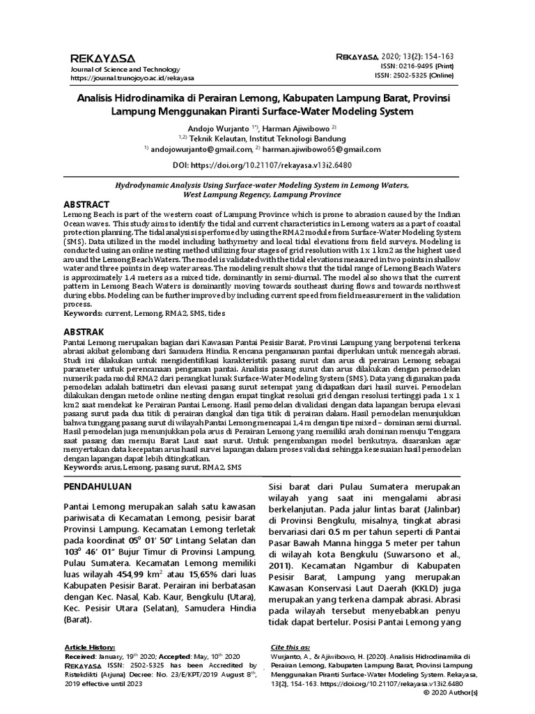 Studi ini dilakukan untuk mengidentifikasi karakteristik pasang surut dan arus di perairan Lemong sebagai