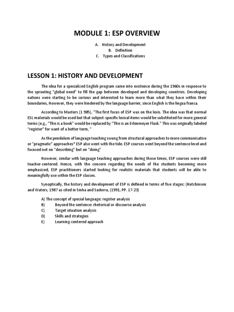 According to Masters (1 985), "The first focus of ESP was on the lexis. The idea was that normal