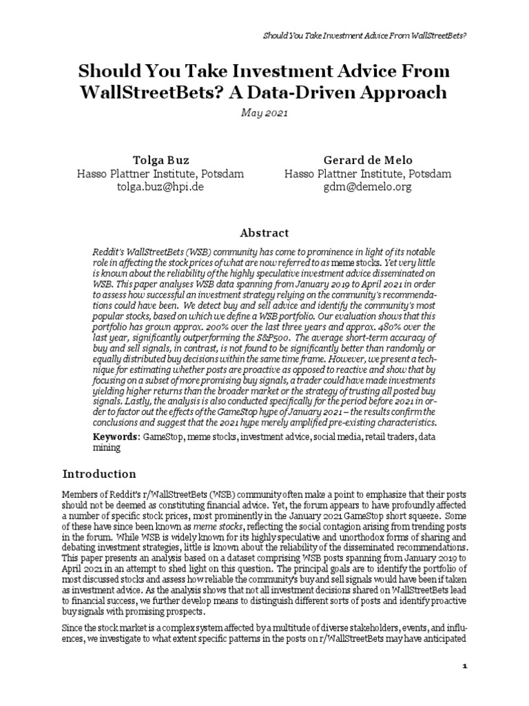 cussions. This paper assesses the reliability of investment advice encountered in the subreddit. The analysis