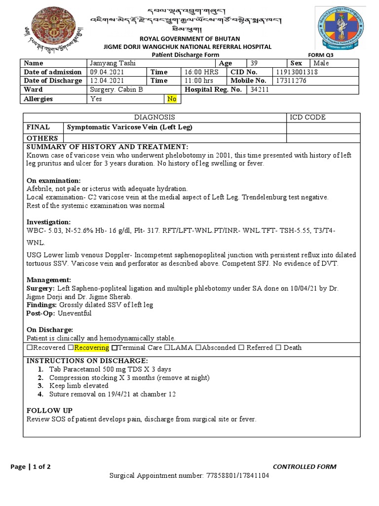 Surgery: Left Sapheno-popliteal ligation and multiple phlebotomy under SA done on 10/04/21 by Dr.