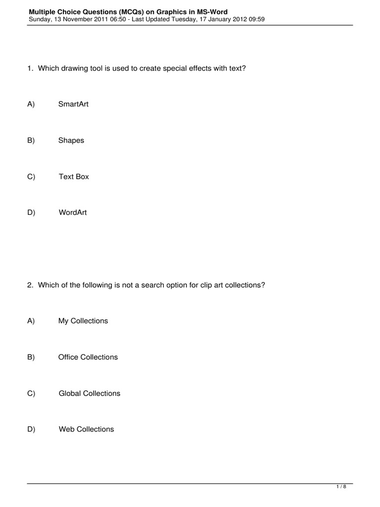 Multiple Choice Questions (MCQs) on Graphics in MS-Word