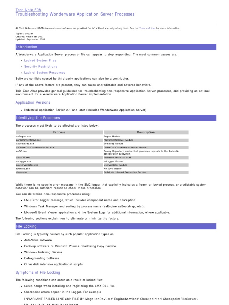 A Wonderware Application Server process or file can appear to stop responding. The most common causes are: