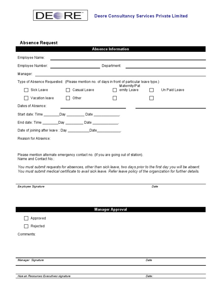 Type of Absence Requested: (Please mention no. of days in front of particular leave type.)
