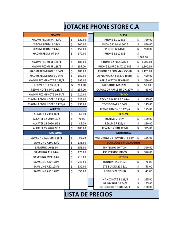 XIAOMI REDMI 9T 128/4 $ 185.00 IPHONE 12 PRO 128GB $ 1,200.00