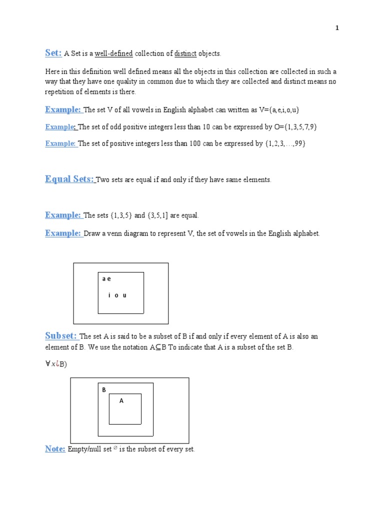 Equal Sets: Two sets are equal if and only if they have same elements.