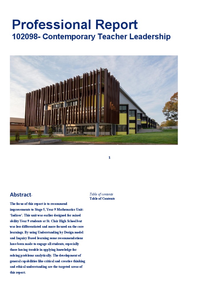 Report’s objective- The goal of the report is to evaluate a unit taught in St. Clair High School in Stage 5 year 9 named as ‘Indices’. This unit is