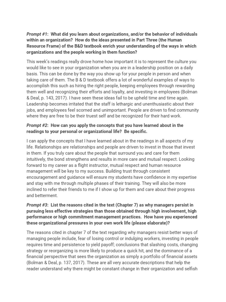 Prompt #4: As outlined by Bolman and Deal (Chapter 7), although every organization