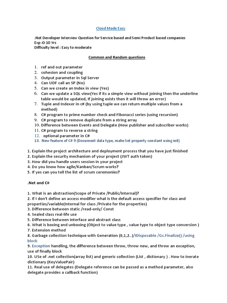 .Net Developer Interview Question for Service based and Semi Product based companies