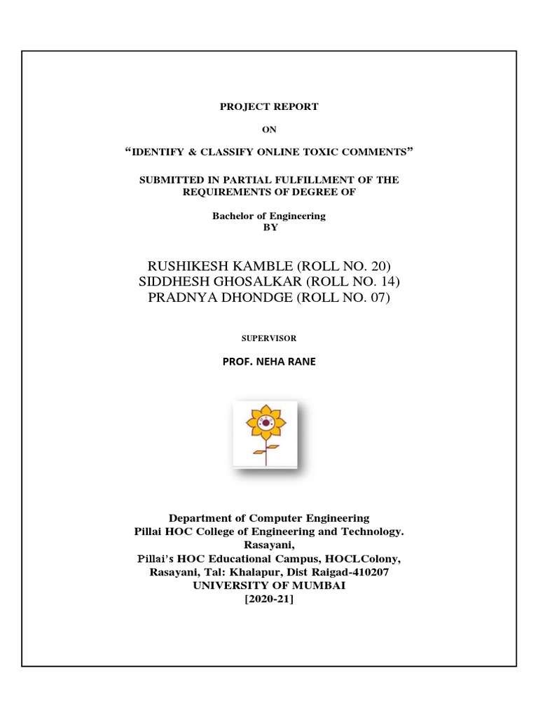 This is to certify that the project work entitled" IDENTIFY & CLASSIFY ONLINE TOXIC