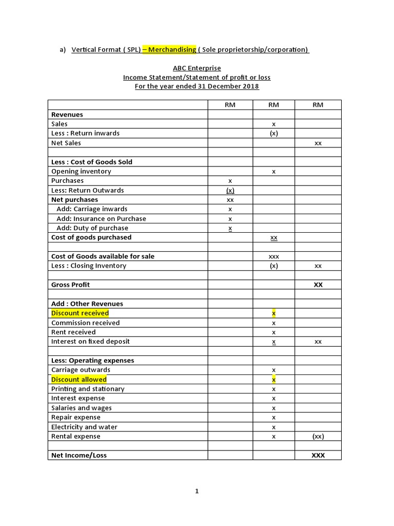a) Vertical Format ( SPL) – Merchandising ( Sole proprietorship/corporation)