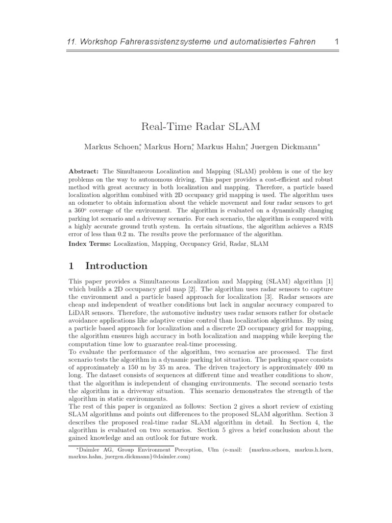 Daimler AG, Group Environment Perception, Ulm (e-mail: {markus.schoen, markus.h.horn,