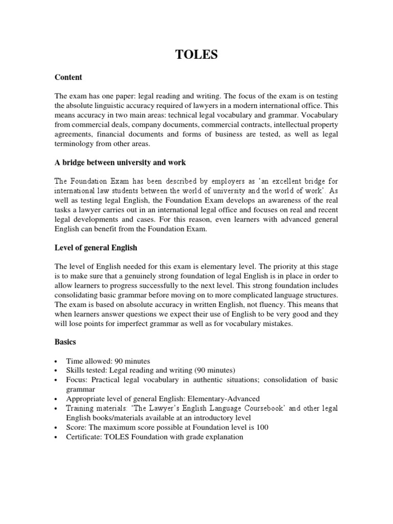 The focus of all of the TOLES exams is absolute accuracy, a strong legal vocabulary and