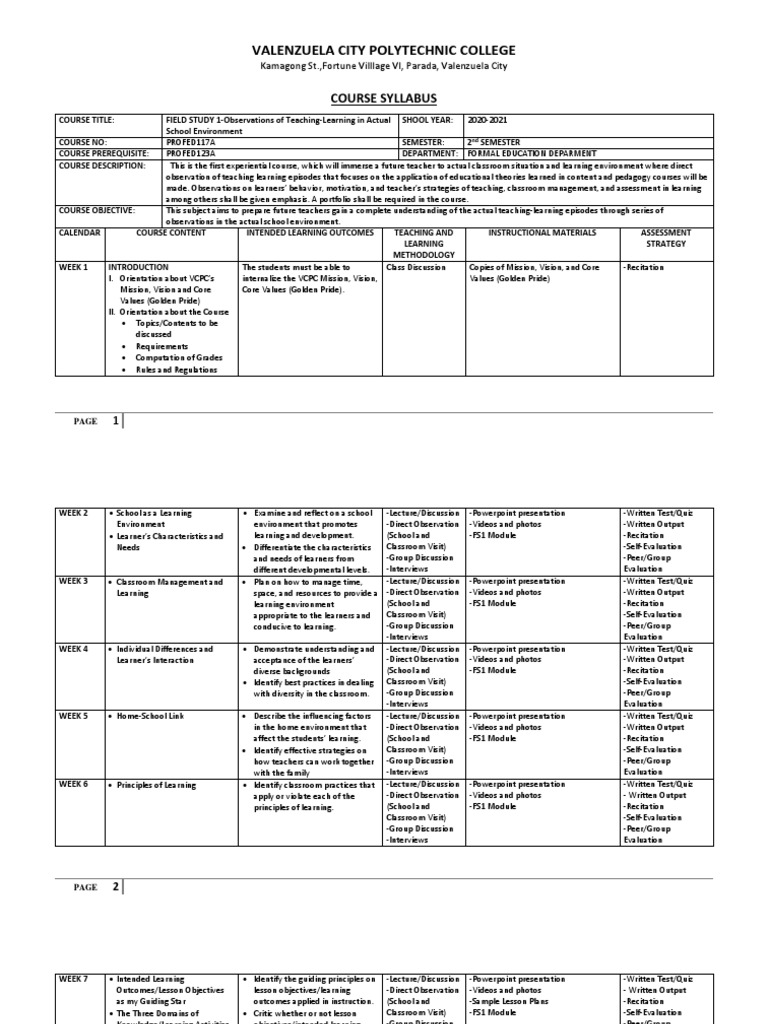 COURSE TITLE: FIELD STUDY 1-Observations of Teaching-Learning in Actual SHOOL YEAR: 2020-2021