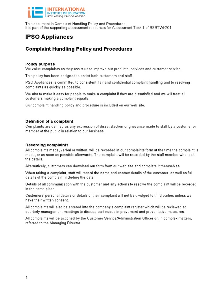 PSO Appliances is committed to consistent, fair and confidential complaint handling and to resolving