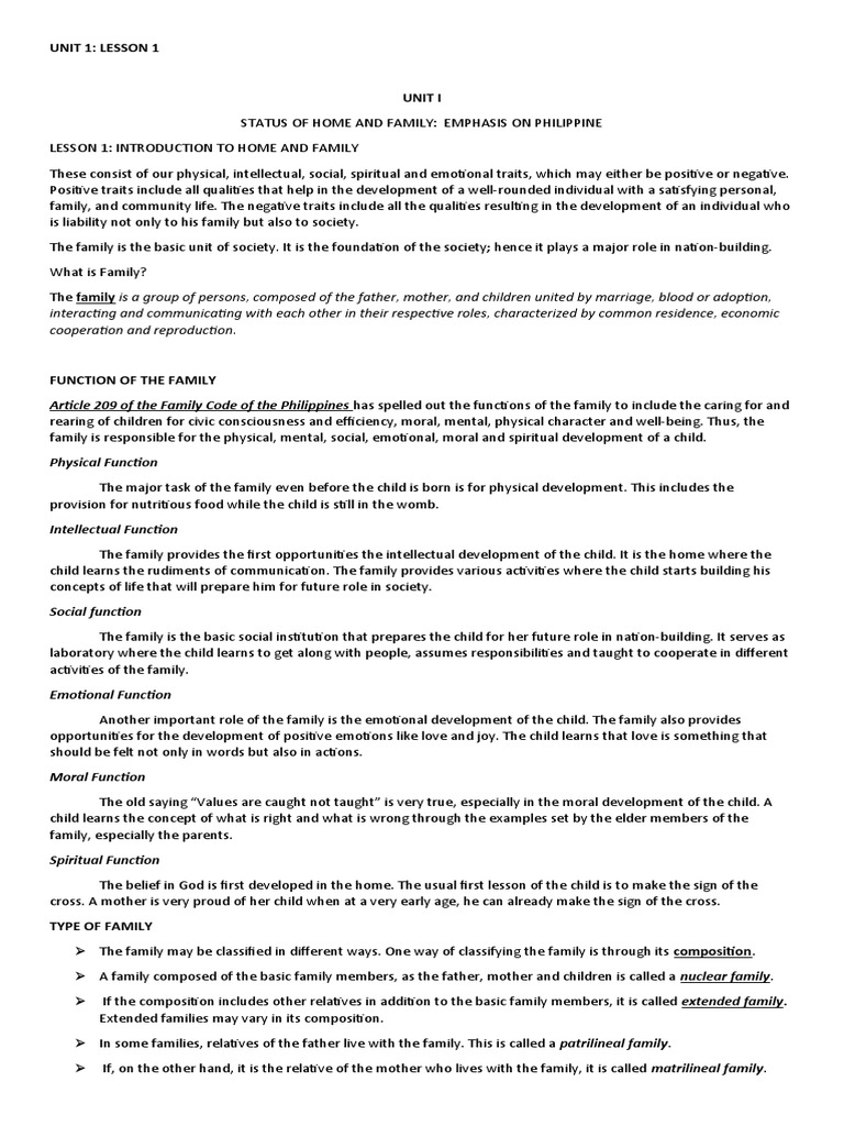 LESSON 1: INTRODUCTION TO HOME AND FAMILY