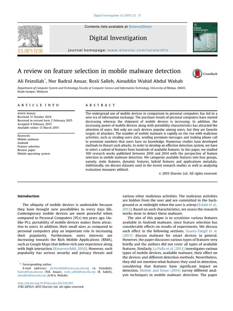science/article/pii/S1084804513001227. feature selection for android malware analysis, In: 4th International