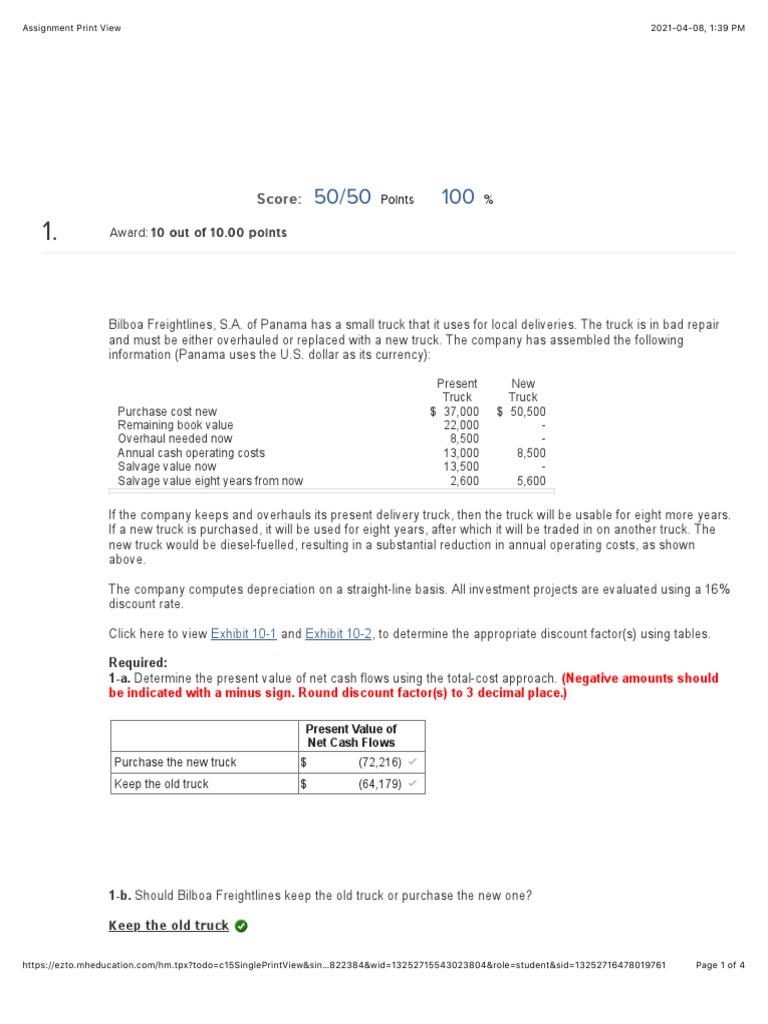 1-b. Should Bilboa Freightlines keep the old truck or purchase the new one?