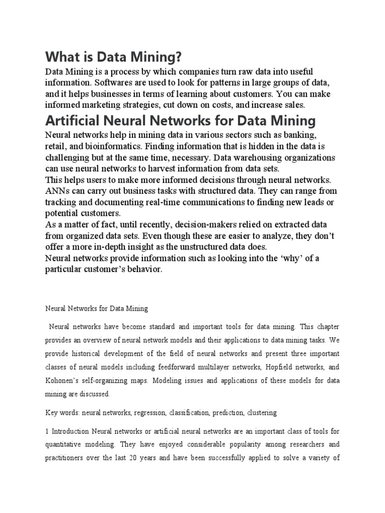 warehouses, neural networks are just one of the tools used in data mining. ANNs are used to find