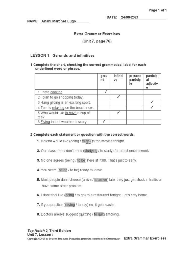 Copyright ©2015 by Pearson Education. Permission granted to reproduce for classroom use. Extra Grammar Exercises