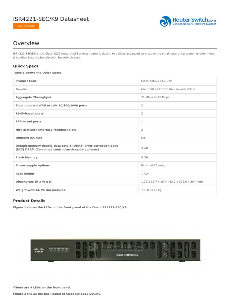 ISR4221-SEC/K9 is the Cisco 4221 Integrated Services router is design to deliver advanced services to the small enterprise branch environment.