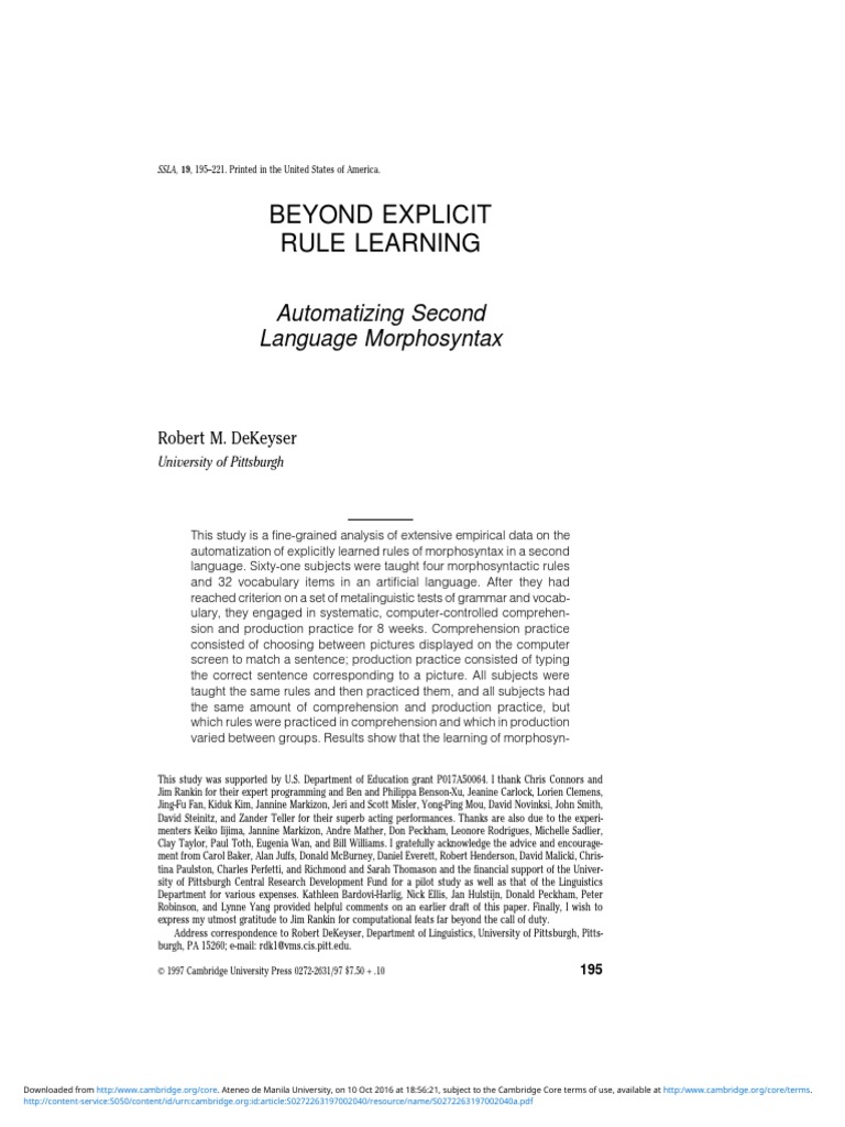 Address correspondence to Robert DeKeyser, Department of Linguistics, University of Pittsburgh, Pitts-