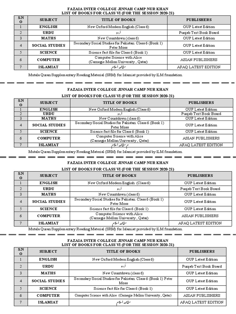 LIST OF BOOKS FOR CLASS VI (FOR THE SESSION 2020-21)