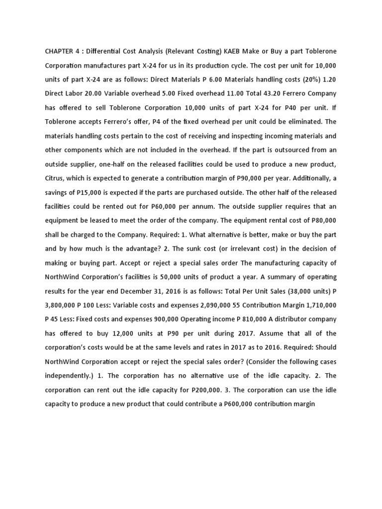 CHAPTER 4 : Differential Cost Analysis (Relevant Costing) KAEB Make or Buy a part Toblerone
