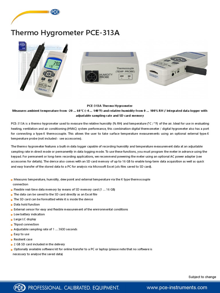 PCE-313A is a thermo hygrometer used to measure the relative humidity (% RH) and temperature (°C / °F) of the air. Ideal for use in evaluating