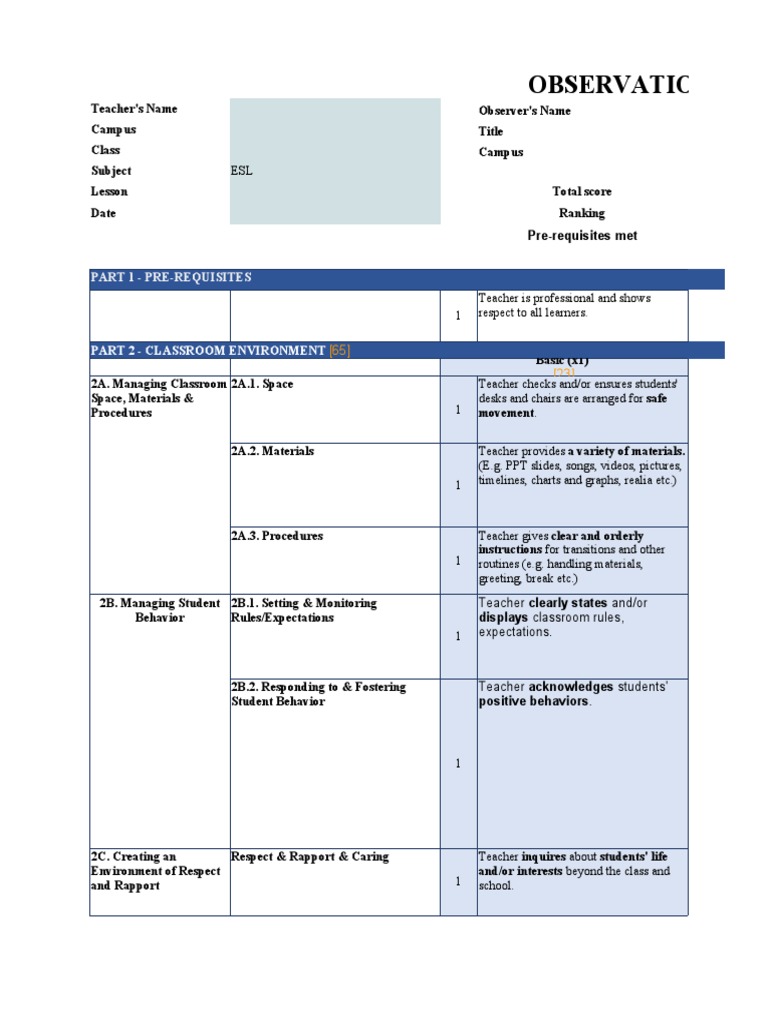 Teacher's Name Observer's Name