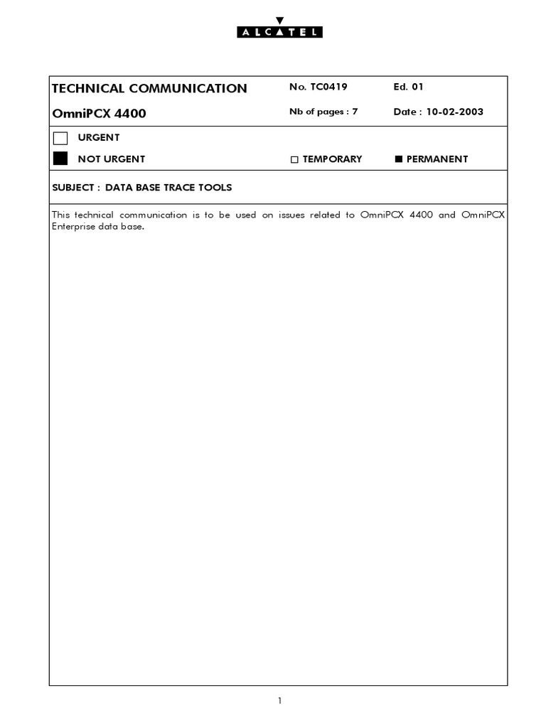 This technical communication is to be used on issues related to OmniPCX 4400 and OmniPCX
