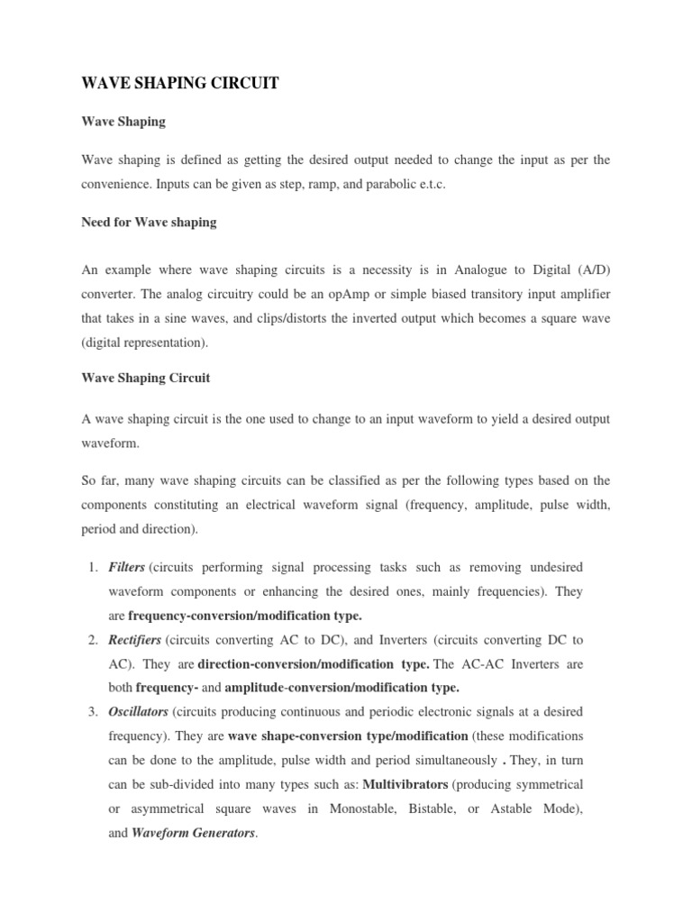 So far, many wave shaping circuits can be classified as per the following types based on the