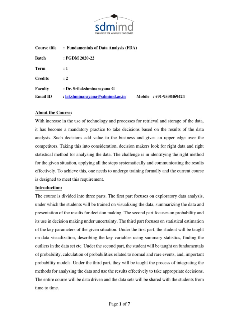 Course title : Fundamentals of Data Analysis (FDA)