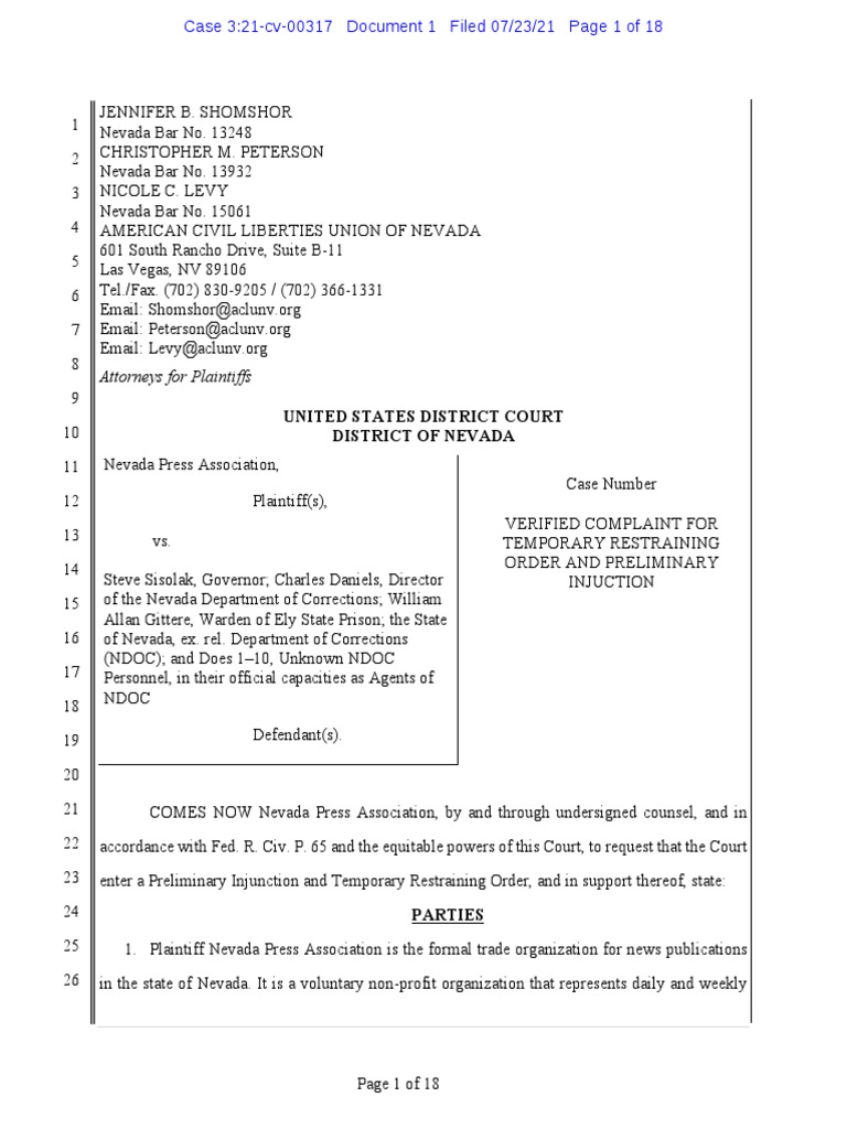 25 1. Plaintiff Nevada Press Association is the formal trade organization for news publications