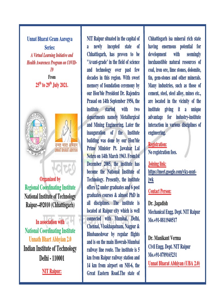 Unnat Bharat Gram Aarogya NIT Raipur situated in the capital of Chhattisgarh isa mineral rich state