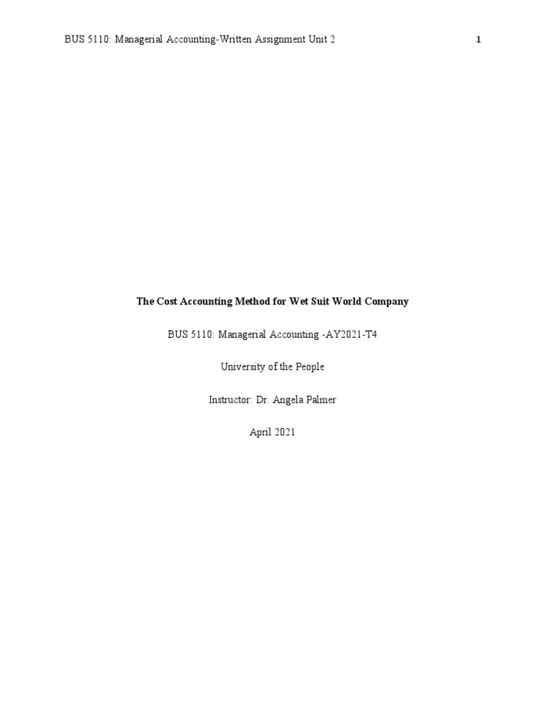 BUS 5110: Managerial Accounting-Written Assignment Unit 2 1