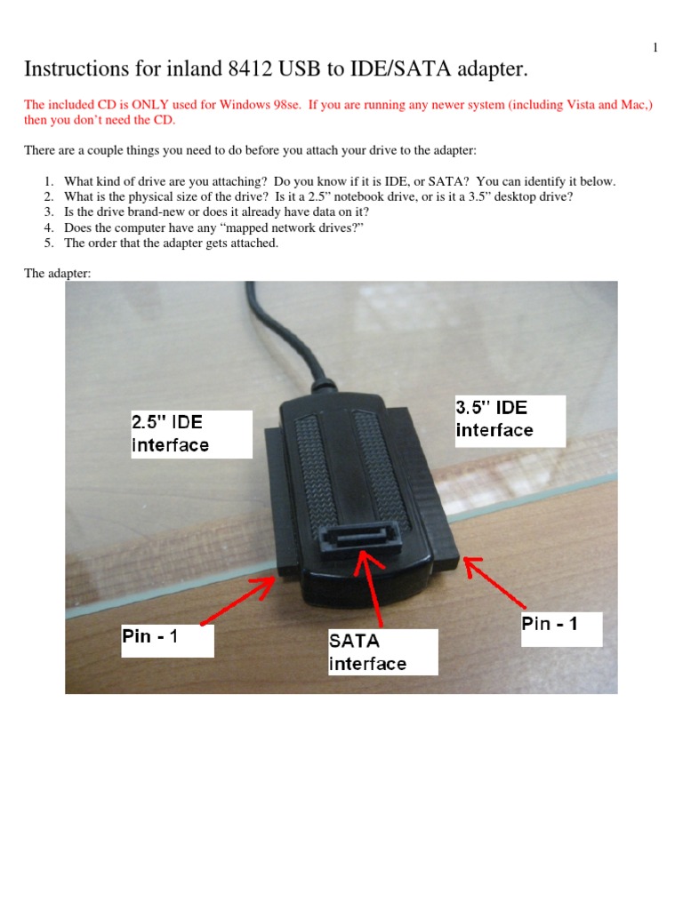 Instructions for inland 8412 USB to IDE/SATA adapter.